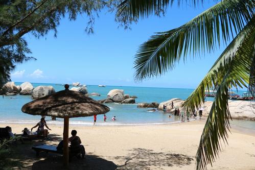 游覽天下第一灣【亞龍灣沙灘】(游覽時間約60分鐘)擁有近7千米長的銀白色海灘,沙質相當細膩柔軟。而這里的南海沒有受到污染,海水潔凈透明,遠望呈現幾種不同的藍色,而水面下珊瑚種類豐富,可清楚觀賞珊瑚,適合多種水面水下活動包括浮潛、深淺、水上滑翔傘等,令該地成為了當地的旅游的核心。